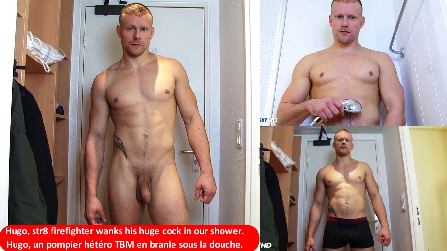 Hugo, the hetero firefighter from our dreams hard cock in our shower.