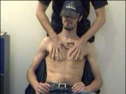 J'ai commencé le massage de son superbe torse musclé sec, et j'ai senti en insistant doucement sur ses têtons que cela lui plaisait. J'ai vu qu'au travers de son sous-vêtement, sa queue durçissait
