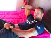 à balancer dans tous les sens lorsqu'il se laisse branler sa grosse et longue bite de footballeur.